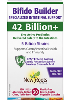 Specialized intestinal support, New Roots Bifido Builder Specialized Intestinal Support delivers 42 Billion+ live active probiotics safely to the intestines. Bifido Builder is a Bifidobacteria strain–only formula providing 42 billion CFUs of 5 proven Bifidobacteria strains. It delivers therapeutic, colonizing strains beneficial for immune performance. Known to be some of the most important microorganisms in the intestines, Bifidobacteria strains are among the most-researched pioneer probiotics which naturally colonize our gut microbiome in infancy. New Roots Bifido Builder’s GPS™ capsules have a natural enteric coating that survives stomach acid and ensures the probiotics reach the intestines alive, where they can colonize to benefit your health. New Roots Bifido Builder Specialized Intestinal Support combines 5 extensively researched strains beneficial for immune-system function and gastrointestinal health.