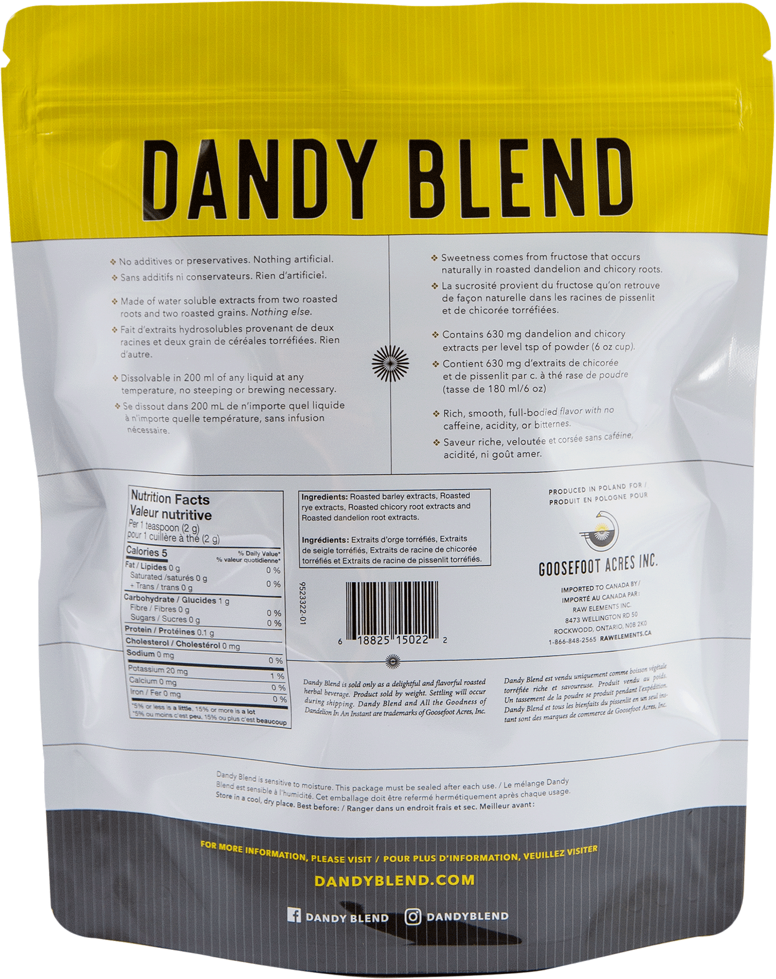 - It is made of water-soluble extracts of roasted roots of dandelion, chicory and the grains of barley and rye. Nothing else is added. While we make no claims for Dandy Blend other than that it is a delicious herbal beverage with the taste, body, and texture of coffee, the ingredients – dandelion, chicory and barley and rye grains – are all health-promoting foods respected throughout the world.