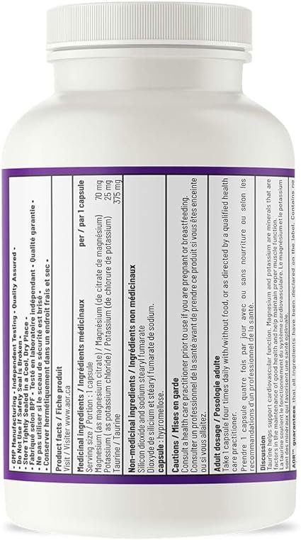 Magnesium and potassium are electrolyte minerals that have many important functions, including maintaining the activity of nerves and muscles, regulating water retention and supporting a healthy acid-base balance. Studies suggest that 50-90% of the population is deficient in magnesium, and deficiencies in potassium often occur along with magnesium deficiencies since the minerals are closely related in function. Taurine is the most abundant free amino acid within the heart muscle and shares many of the same functions as magnesium, making it an ideal complement to the mineral.