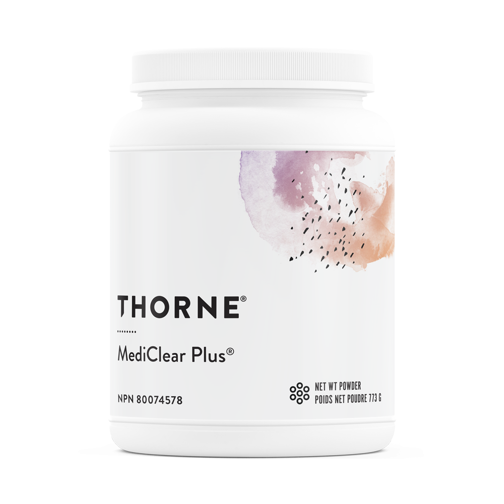 The liver and other organs of elimination in the body are challenged by environmental and diet-related toxins, as well as the inability of nutrient-deficient vegetables, grains, and fruits to provide all the nutrients that are necessary for detoxification. MediClear PlusĀ® is a low-allergenic, rice-and-pea-protein-based supplement that is formulated to support liver and colon detoxification.* This unsweetened, unflavored member of Thorne’s MediClear suite provides essential detox nutrients and botanicals along with a complete range of vitamins and minerals in their most absorbable, tissue-ready forms.* MediClear Plus includes well-absorbed curcumin phytosome, grape seed phytosome, and green tea phytosome to help maintain the body’s normal inflammatory response to toxic insults.* MediClear Plus is provided in a powder form that mixes easily with water, juice, or nut milks.*