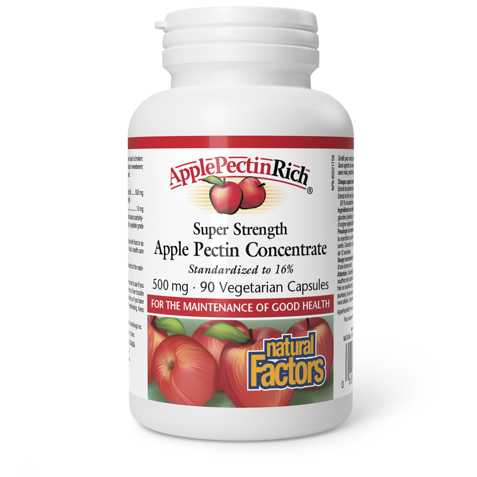 Natural Factors ApplePectinRich Super Strength Apple Pectin Concentrate is a unique pectin-rich product made from whole apples, including the flesh, core and especially the peel, which concentrates pectin and other phytonutrients. ApplePectinRich is standardized to ensure consistency and potency, and provides 300 mg of fibre per 500 mg capsule.Eating apples is consistently associated with better health due to natural high levels of antioxidants, phytonutrients, and both soluble and insoluble fibre. Pectin is the soluble fibre in apples and is especially beneficial due to its ability to improve digestive health by acting as a prebiotic fibre and promoting healthy stomach and intestinal mucosa. Because it creates bulk and slows gastric emptying, it also increases satiety while balancing blood sugar and cholesterol. Pectins are complex polysaccharides (fibres) present in the cell walls of plants. ApplePectinRich also contains green tea extract standardized to 50% catechins for optimal antioxidant protection. Green tea is rich in polyphenols, antioxidant compounds that help prevent free radical damage to cells and promote optimal health. It is often credited with bestowing health and longevity. Natural Factors’ proprietary EnviroSimplex process ensures high-potency extracts that consistently deliver the highest levels and the broadest ranges of key phytonutrients using a low-temperature process.