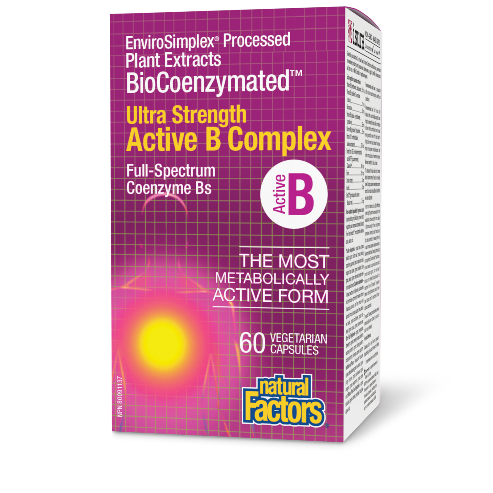 Natural Factors BioCoenzymated™ Ultra Strength Active B Complex provides meaningful amounts of essential B vitamins in their most bioactive forms to help support energy metabolism, normal growth and development, and overall health. This one-per-day, non-GMO formula is suitable for vegetarians and vegans and features Farm Fresh Factors®, a bioenergetic blend of phytonutrients, for active support of energy metabolism.