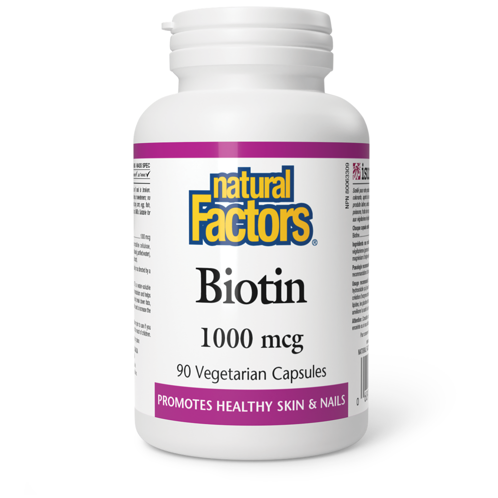 Biotin is a water-soluble essential nutrient that is part of the B complex family of vitamins. It is found in trace amounts in all animal and plant tissue and is also produced in the intestines.A number of enzymes require biotin as a coenzyme in order to function properly in various metabolic activities. It assists in the synthesis of fatty acids, in nucleic acid synthesis, and in the metabolism of fats and carbohydrates. Biotin has also been found to stimulate the production of glycogen, the storage form of glucose that acts as an energy reserve in the muscles.Biotin assists with the proper functioning of other vitamins in the B complex family. Sufficient quantities are required for healthy hair and skin. A deficiency of biotin mainly affects the skin and hair, with symptoms such as hairloss, dermatitis, grayish skin colour, and a rash around the nose and mouth.Natural Factors Biotin tablets help to maintain overall good health and assist the body to metabolize fats and carbohydrates. Only one tablet daily is required to help improve hair and skin condition in those with signs of deficiency.