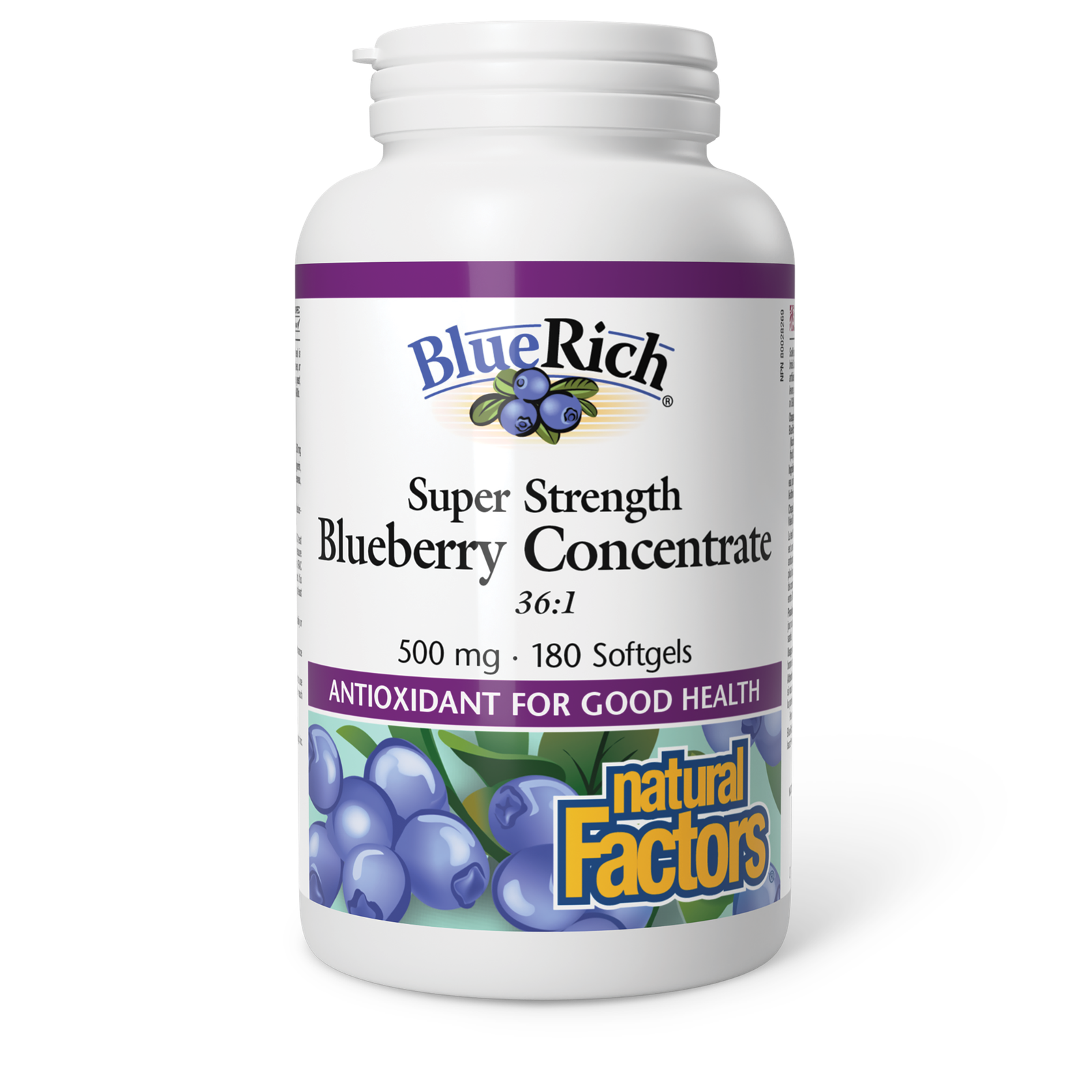 BlueRich Super Strength Blueberry Concentrate provides a high dose of bioactive blueberry nutrients known to enhance vision, support healthy blood sugar levels, and protect cognitive performance. The high anthocyanin content increases capillary integrity, inhibits free radical damage, and stimulates blood flow by improving vascular smooth muscle tone. Blueberry?s antibacterial activity also inhibits bacteria from adhering to the urinary tract and causing urinary tract infections.Potent antioxidants in BlueRich support healthy cholesterol levels and blood pressure. Its high ORAC (oxygen radical absorbance capacity) score indicates that BlueRich is effective at fighting the free radicals that accelerate disease and aging.Natural Factors proprietary low-temperature EnviroSimplex? process ensures high potency extracts that consistently deliver the highest levels and the broadest range of key phytonutrients. BlueRich is a 36:1 concentrate made from high-quality, Canadian-grown blueberries. It contains 100% whole blueberry fruit solids with no added sugar, water, flavour, colour, or preservatives. Two softgels provide the equivalent of ? cup of fresh blueberries in addition to naturally occurring vitamins A, B, C, and E, zinc, copper, and magnesium. BlueRich is an effective way to reap the health benefits of blueberries all year round.