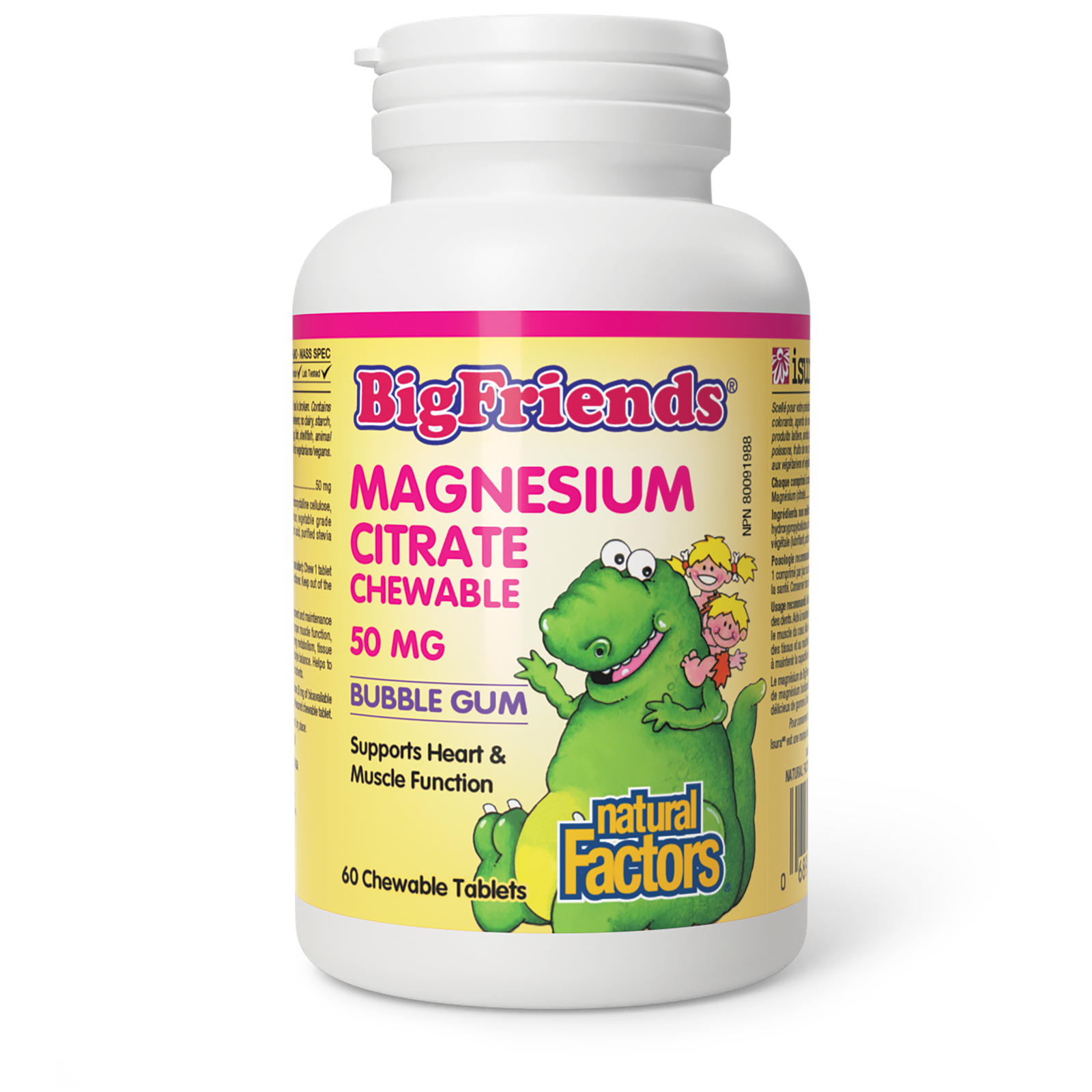 Kids Magnesium Citrate from Natural Factors provides a tasty, chewable way to help children meet their daily magnesium requirements. This one-per-day formula provides 50 mg of bioavailable magnesium citrate in a delicious bubble gum-flavoured chewable tablet to support children?s growth and development.Magnesium is often known as a relaxation mineral, but children?s growing bodies also need magnesium to conduct hundreds of additional biochemical processes. It is essential for the proper development and maintenance of bones and teeth, as well as maintaining proper muscle function and tissue formation. Magnesium also provides a source of electrolytes and helps with nutrient metabolism. Despite its importance, many Canadians are deficient in magnesium, making a daily magnesium supplement an important part of a well-balanced nutrition plan for children. Kids Magnesium Citrate is a suitable choice for parents of fussy eaters who would like their children to take a supplemental source of magnesium. The easy-to-take chewable tablets are gently sweetened with tooth-friendly xylitol and stevia, and contain no artificial preservatives, sweeteners, gluten, or GMOs. They are made specifically for children age 3 and up, and adolescents.