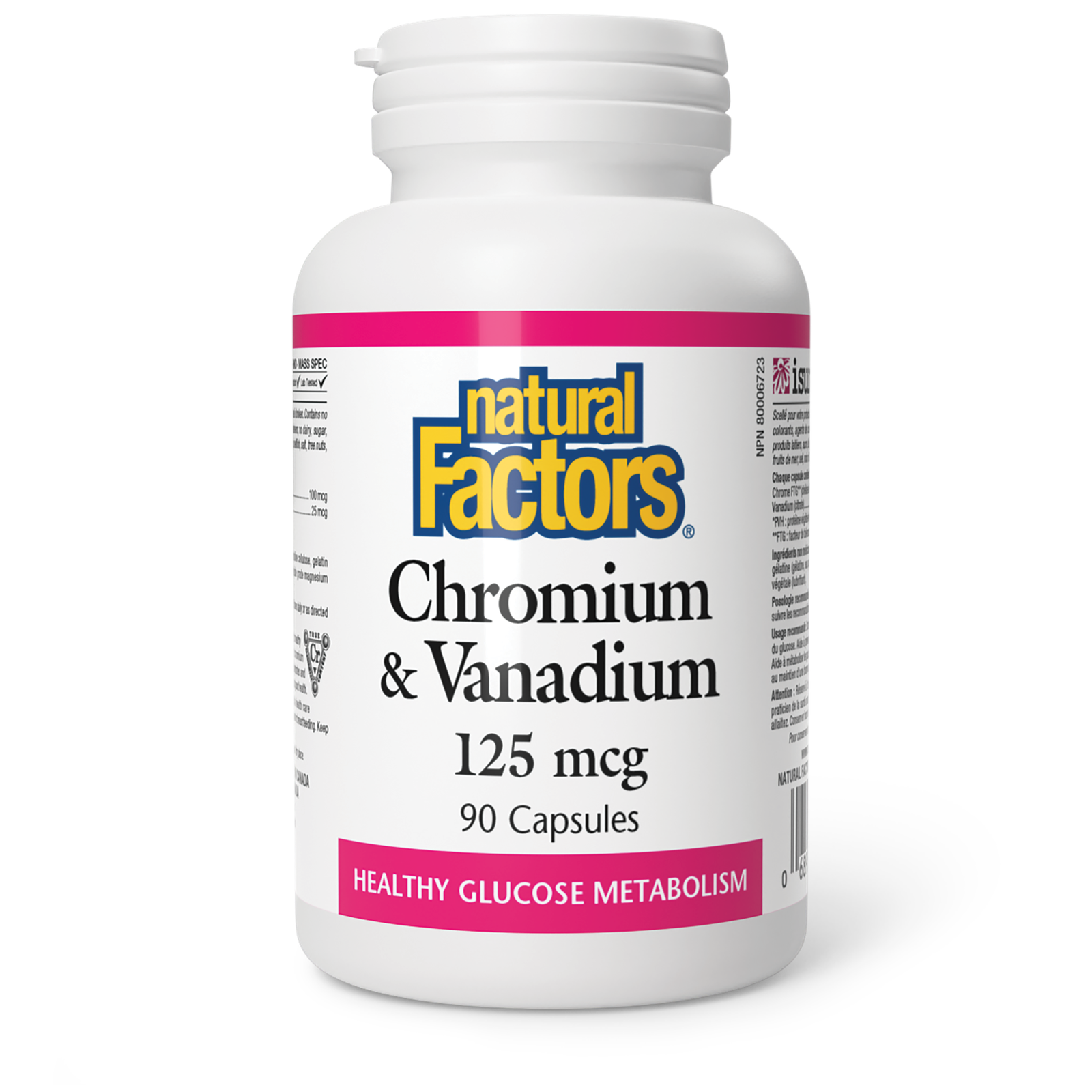 In small amounts, chromium is essential for metabolic processes that regulate blood sugar, and help insulin transport glucose into cells, where it can be used for energy. Chromium maintains stable blood sugar levels through proper insulin utilization and therefore helps maintain normal metabolism and proper weight.As it enhances the action of insulin, chromium is necessary for storage of fats, proteins, and carbohydrates. It is needed for energy production and is also vital in the synthesis of cholesterol, fats, and proteins. Inadequate intake of chromium has been linked to glucose intolerance. Vanadium has been shown to have the ability to improve insulin utilization, resulting in improved glucose tolerance. Natural Factors Chromium & Vanadium supplies two essential minerals for healthy glucose metabolism. It helps the body metabolize carbohydrates and fats, and is a factor in the maintenance of good health. These minerals are chelated to help increase absorption and are highly suitable for those with digestive disturbances.
