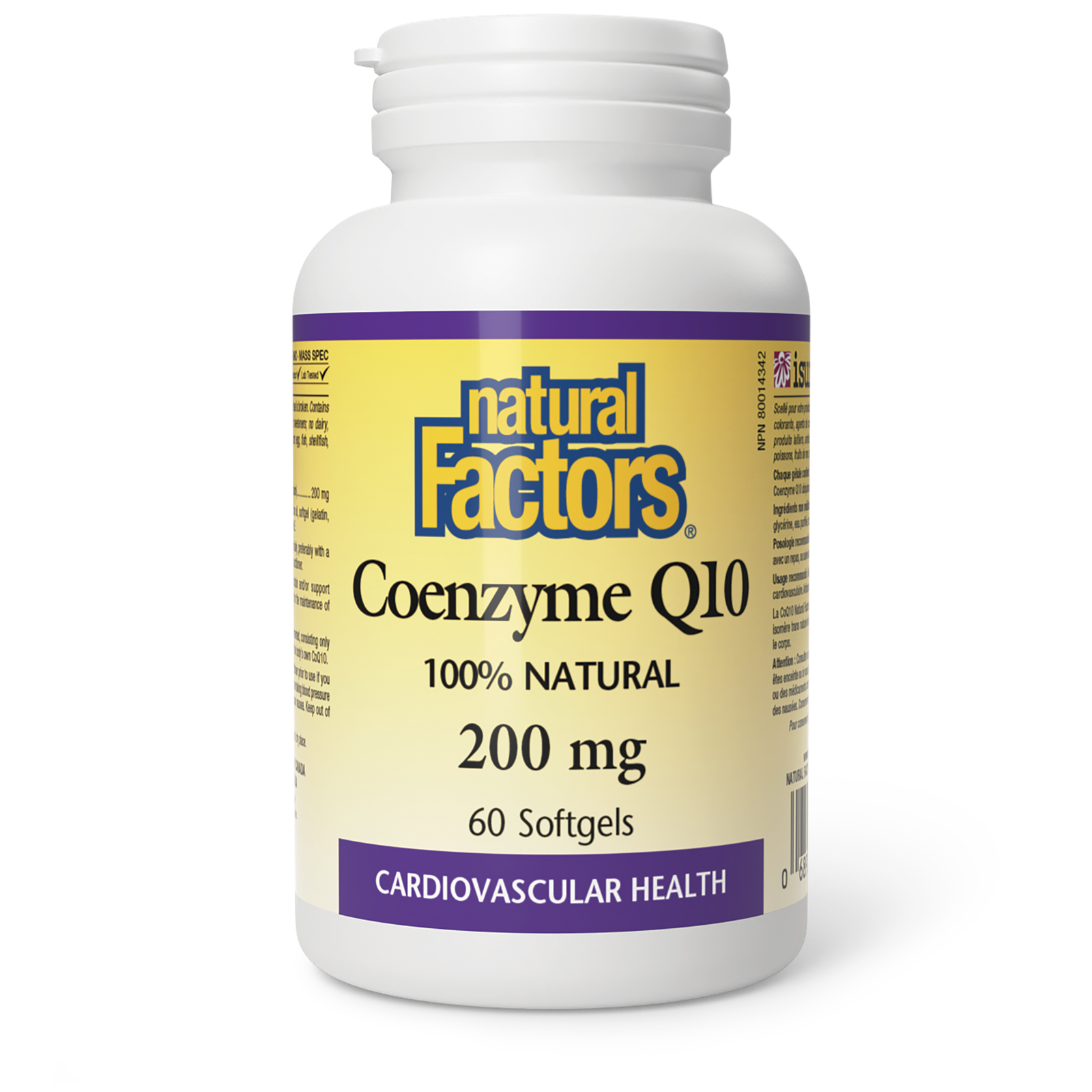 Natural Factors Coenzyme Q10 is a 100% natural source of CoQ10 used to support cardiovascular health. CoQ10 is a vitamin-like essential nutrient found within the mitochondria of every cell of the body. It contributes to cellular energy production and facilitates energy delivery to metabolic processes, making it essential for the health of all tissues and organs throughout the body. CoQ10 is most concentrated in the heart tissue and plays a critical role in maintaining healthy heart contractions. As an antioxidant, CoQ10 protects against the free radicals responsible for oxidative stress.