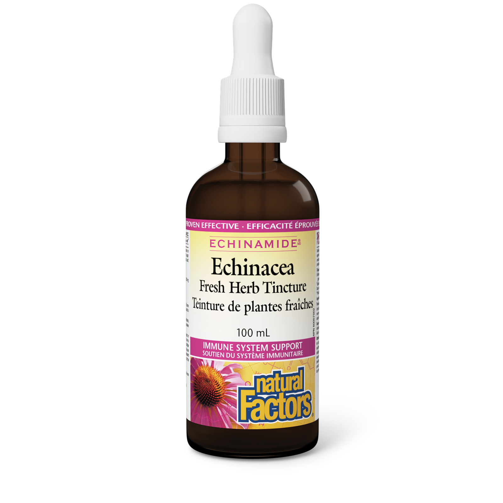 ECHINAMIDE is the only echinacea extract clinically proven to increase immune response. When taken at the first sign of symptoms, Natural Factors ECHINAMIDE Echinacea Fresh Herb Tincture can help stop a cold from developing, ease symptoms, and accelerate healing. Backed by more than a decade of research, ECHINAMIDE has been clinically proven as an effective treatment for upper respiratory tract infections in multiple randomized, double-blind, placebo controlled trials. A patented extraction method guarantees consistent levels of the three plant actives in Echinacea purpurea: alkylamides, cichoric acid, and polysaccharides. These compounds are the foundation of ECHINAMIDE?s powerful ability to reduce the length and severity of viral infections, and the whole herb base ensures no minor actives are missing.While many supplements use only the purple flowers of this herb, ECHINAMIDE uses both flowers and the highly potent roots. Natural Factors? herbs are grown to the highest organic standards on a certified organic farm in British Columbia, or wild-crafted from organic sources and harvested when active ingredients are at their peak concentration. Each batch is rigorously tested to ensure purity and potency. The 1:1 liquid extract is equivalent to 1000 mg of crude herb.