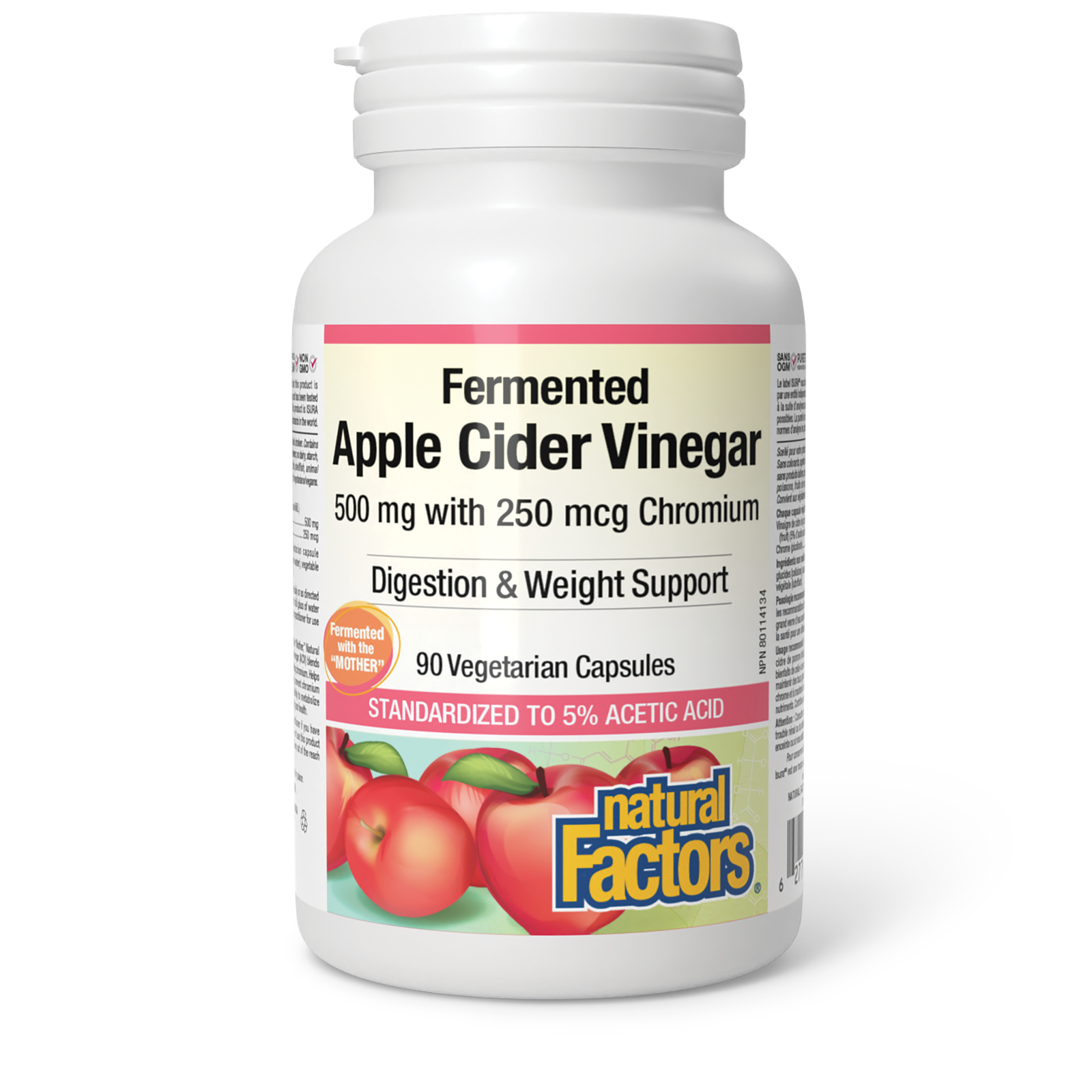 Natural Factors Fermented Apple Cider Vinegar with Chromium combines the traditional benefits of apple cider vinegar (ACV) with the glucose metabolism benefits of chromium picolinate in a convenient capsule format.
