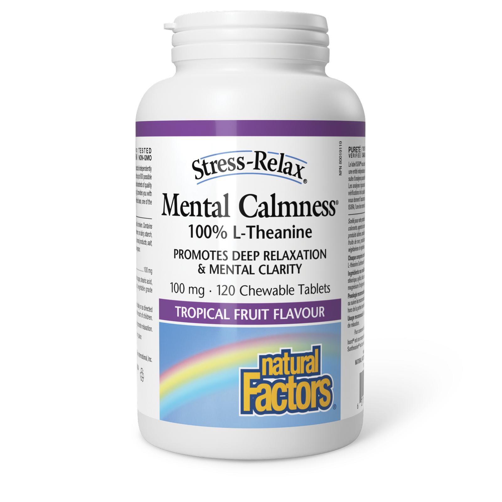 Prolonged daily stress, nervousness, and being over-committed can have a negative effect on physical, emotional, and mental health. In our 24/7 world, it is easy to feel overwhelmed by our obligations to work, family, finances, relationships, and ourselves. Finding balance is key. Stress-Relax Mental Calmness from Natural Factors temporarily promotes relaxation with Suntheanine? L-theanine, an amino acid derived from green tea through a proprietary fermentation process. This process mimics the natural process in green tea leaves, resulting in a 100% pure L-isomer-theanine. Daily use of Mental Calmness produces a sense of calm and mental clarity, helping anyone who feels nervous and ?stressed out? to regain control.Suntheanine L-theanine exerts noticeable effects within 30?40 minutes of ingestion without causing drowsiness. It helps with stress, calms the nerves, improves mood, and even promotes learning and concentration. Best of all, it is considered safe when taken long-term.These delicious, chewable tablets are convenient for daytime use and can be taken alone or in combination with other Stress-Relax products. This is an effective formula to promote relaxation in anyone 19 years and older who wants to keep pace during a heavy mental or physical workload or who is feeling overwhelmed with symptoms of daily stress.