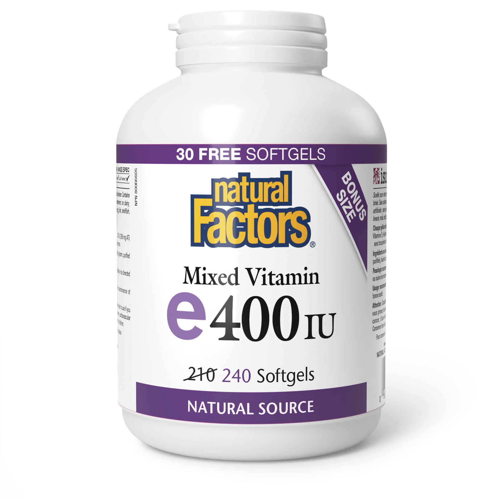 Vitamin E is a fat-soluble vitamin that is comprised of a group of eight compounds: four tocopherols and four tocotrienols. Vitamin E activity is most often attributed to the d-alpha tocopherol form; however, research shows that beta-, gamma-, and delta-tocopherols also have significant biological activity in the body. Gamma-tocopherol has specifically been shown to exhibit superior anti-inflammatory and antioxidant properties.Natural Factors Mixed Vitamin E contains d-alpha tocopherol, along with beta-, delta-, and gamma- tocopherols. D-alpha tocopherol, the most potent tocopherol, is natural and is more available for use in the body than its synthetic counterpart dl-alpha tocopherol. Mixed vitamin E tocopherols enhance the anti-inflammatory and antioxidant activity of a single tocopherol vitamin E. Vitamin E is primarily known for its powerful antioxidant benefits. It helps to protect cell membranes against damage caused by free radicals and prevents the oxidation of LDL (?bad?) cholesterol. Oxidized LDL cholesterol contributes to the development of atherosclerosis, which inhibits normal circulation of oxygenated blood to the tissues. Vitamin E is also necessary for the structural and functional maintenance of cardiac, skeletal, and smooth muscles.