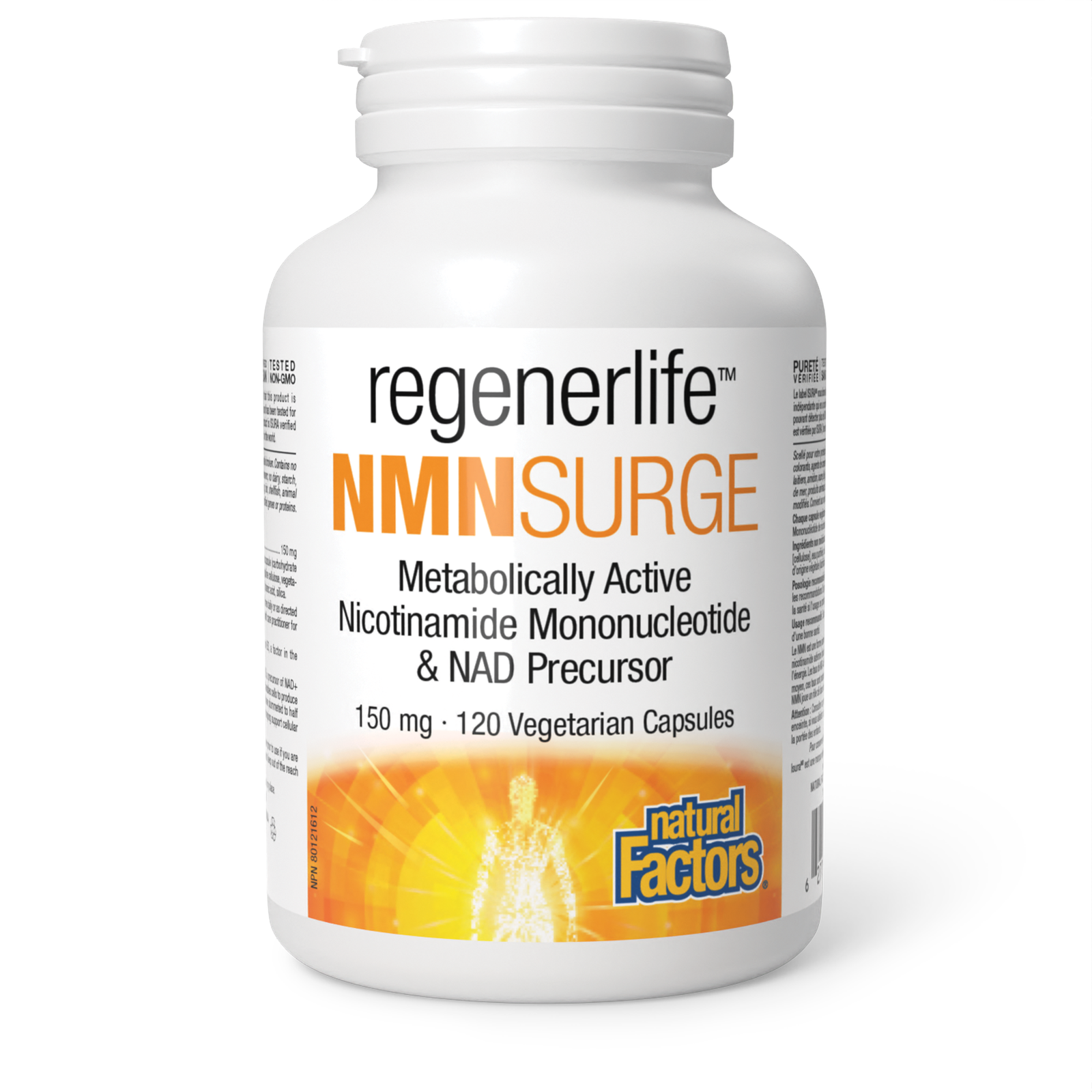 NMNSurge is part of the RegenerLife anti-aging line of supplements formulated for whole-body rejuvenation and longevity. Each vegetarian capsule provides 150 mg of NMN as a factor in the maintenance of good health. It is non-GMO, vegetarian- and vegan-friendly, and a great choice for anyone who wants to complement healthy lifestyle habits and actively promote longevity.