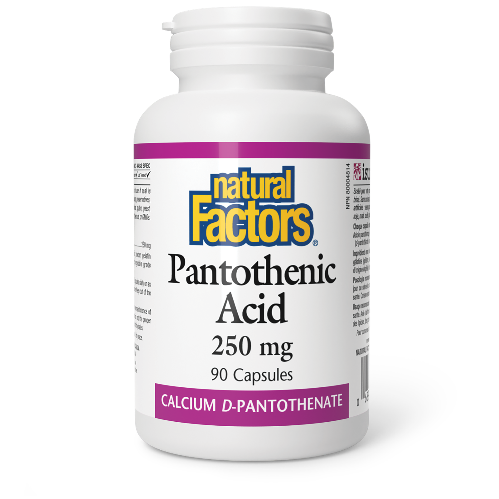 Referred to as the anti-stress vitamin, pantothenic acid or vitamin B5, plays a vital role in the production of adrenal hormones and in the formation of antibodies ? two necessities during times of stress. It also assists and supports the endocrine system and metabolic function.Pantothenic acid aids in the utilization of other vitamins and helps to convert fats, carbohydrates and proteins into energy as well as rebuild tissue, muscles and organs. It is a component of coenzyme A (CoA), an essential coenzyme in a variety of reactions that sustain life. CoA is required for chemical reactions that generate energy from food. CoA is also required for the synthesis of fatty acids, which are fat molecules essential for normal physiological function.Natural Factors Pantothenic acid provides 250 mg of this very important B vitamin per capsule, for the maintenance of good health. 1?2 capsules daily will help to relieve effects from daily stress and help the body metabolize fats, proteins and carbohydrates into usable energy.