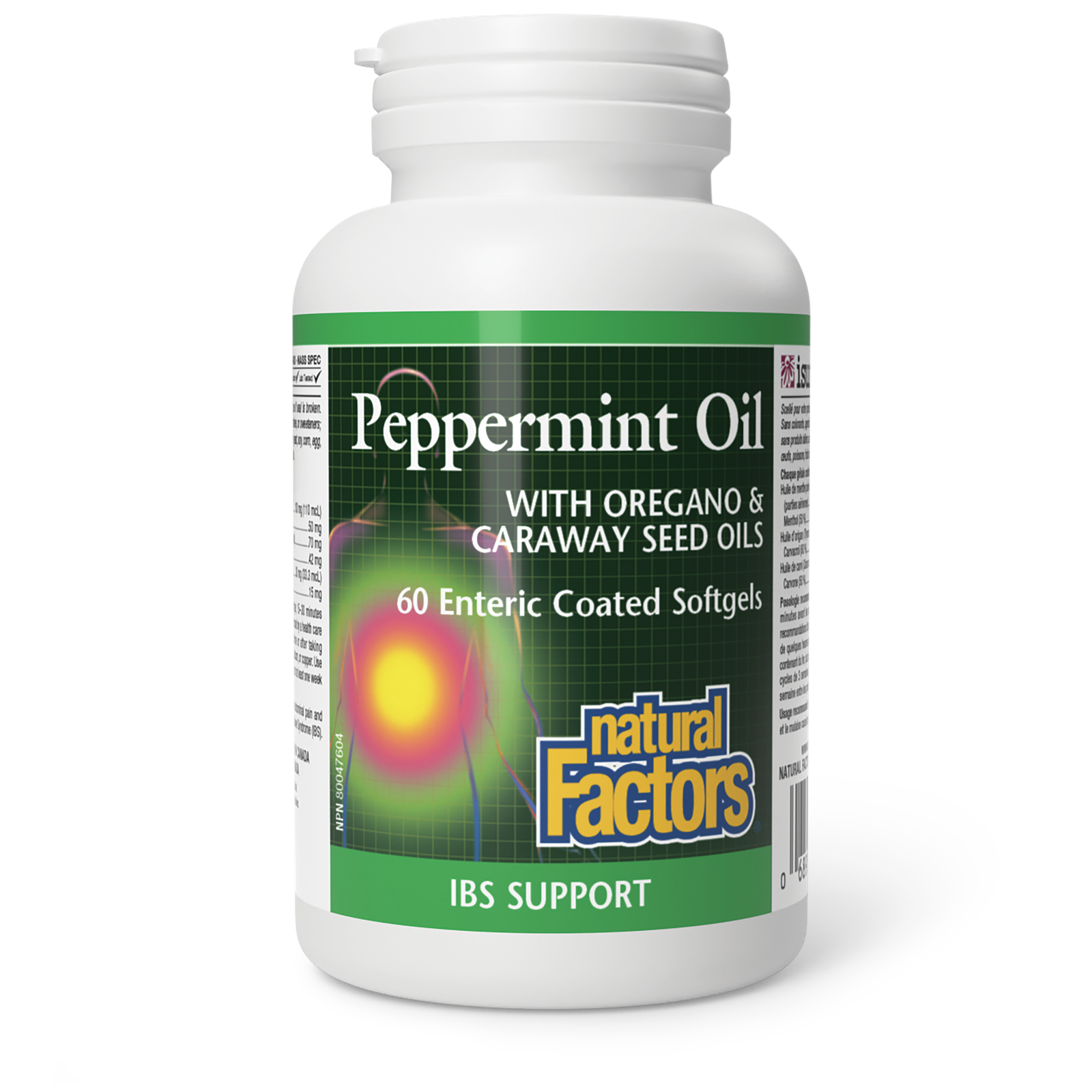 It is estimated that approximately 15% of the population has complaints of irritable bowel syndrome (IBS), making IBS one of the most common gastrointestinal disorders. Natural Factors Peppermint Oil combines peppermint, oregano, and caraway oils for a natural answer to serious digestive upsets.Peppermint and caraway are both traditionally used in herbal medicine to aid digestion and help relieve uncomfortable symptoms of gas. Peppermint and oregano oils have natural antifungal properties that are effective against the growth of Candida albicans ? a common yeast that can infect and disrupt the delicate balance of the digestive tract. The greatest benefits are achieved when taken in combination with a high-quality probiotic to restore the health of intestinal flora, as well as a multivitamin that includes vitamins C and E to replenish nutrient deficits caused by candida yeast.Each easy-to-swallow softgel is standardized to contain optimal concentrations of key compounds and has an enteric coating to help it pass through the stomach intact and deliver the oil directly to the lower digestive tract. This helps prevent stomach irritation and heartburn, and maximize digestive health where it is needed most.