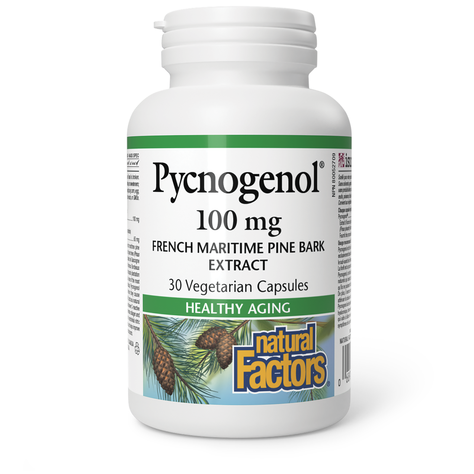 As we age, inflammation and free radicals cause increasing damage, threatening the health of delicate tissues. Natural Factors Pycnogenol? is a natural plant extract derived from French maritime pine bark (Pinus pinaster) that strengthens cell membranes.Pycnogenol helps restore the integrity of tissues, improving skin elasticity and smoothness while supporting the health of blood vessels, lung tissue, and intestinal membranes. Pycnogenol is one of the most potent scavengers of free radicals. It acts as a natural anti-inflammatory, helps generate collagen and hyaluronic acid to repair membranes, and aids in the production of endothelial nitric oxide, which helps dilate blood vessels. Pycnogenol is increasingly recognized as beneficial for improving symptoms of perimenopause, when the body?s natural antioxidant defences, collagen, and hyaluronic acid production begin to decline.The patented extract is sourced, using no pesticides or herbicides, from the bark of pine trees grown exclusively in southwest France. The concentrated formula is extracted using a chemical-free process that guarantees the potency and purity of Pycnogenol?s active compounds, offering standardized amounts of procyanidins and bioflavonoids. Pycnogenol has been extensively clinically tested and found to be effective. The antioxidant power of Pycnogenol is 20 times greater than vitamin C and 50 times greater than vitamin E.