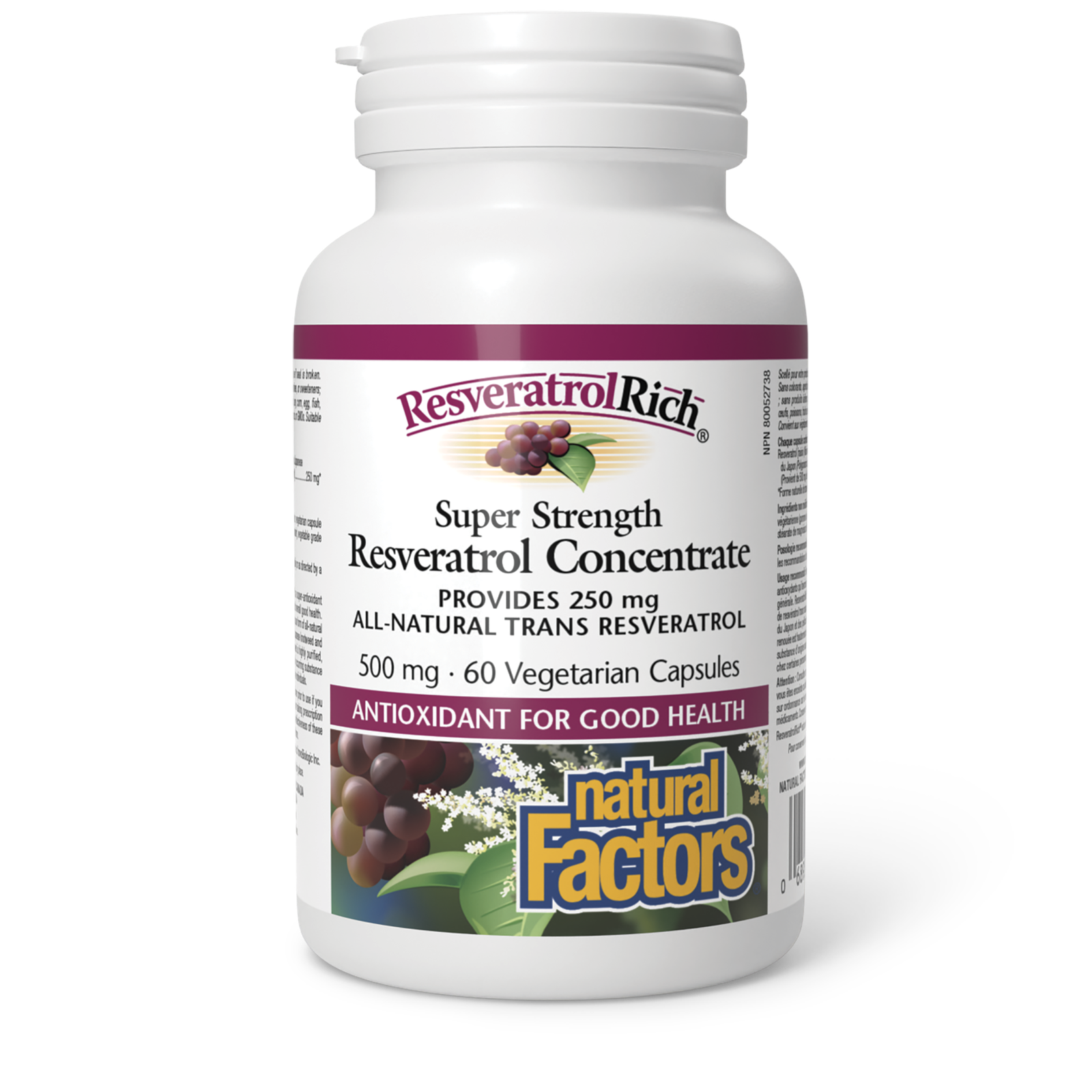 Resveratrol is a type of polyphenol, an antioxidant compound highly concentrated in red grapes ? and therefore wine ? as well as other plants such as Japanese knotweed. It is also found in blueberries and bilberries, but in much lower concentrations. In its natural trans-resveratrol form (the form found in grapes and knotweed) resveratrol helps protect the body from free radicals that cause oxidative damage and inflammation. Because cumulative cell damage from free radicals can speed age-related decline, preventing free radical damage is important to maintaining optimal health throughout the lifespan. Studies show that resveratrol increases the body?s resistance to stress, especially oxidative stress. Taking resveratrol can improve age-related health conditions and increase longevity.Natural Factors ResveratrolRich Super Strength Resveratrol provides a high potency of 250 mg of trans-resveratrol in each 500 mg vegetarian capsule. The resveratrol is extracted from the skins of red grapes (Vitis vinifera), grown in the Okanagan Valley of British Columbia, and from Japanese knotweed (Polygonum cuspidatum). The knotweed is highly purified to remove 99% of the emodin, a natural substance that can act as a laxative in some sensitive people. Knotweed is commonly used in traditional medicines for the liver and heart.