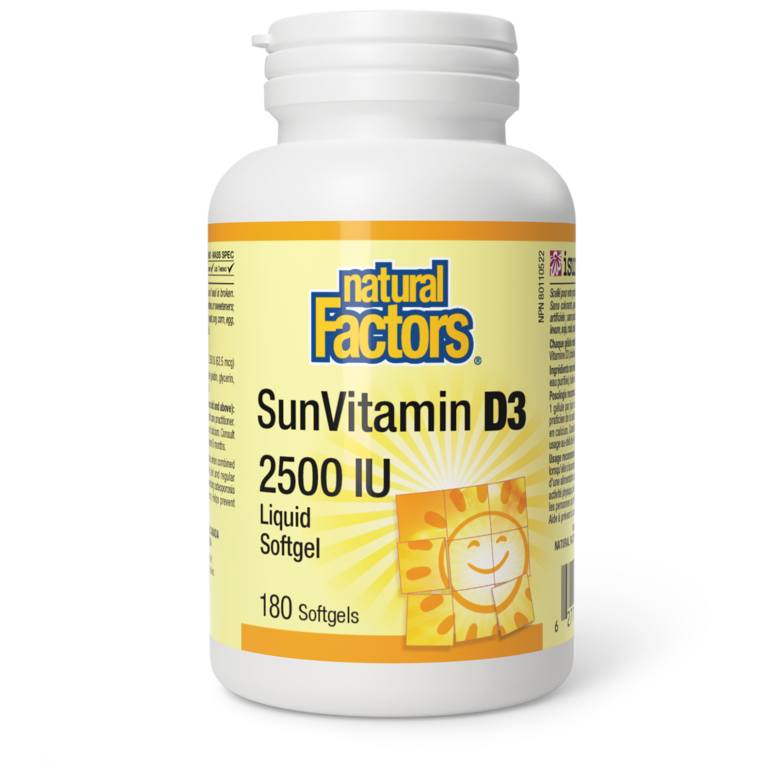 Natural Factors SunVitamin D3 provides a convenient, high-potency dose of vitamin D as cholecalciferol to help prevent vitamin D deficiency, and for the development and maintenance of strong bones and teeth. Vitamin D3 is the natural form of this vital nutrient and is most effective at raising blood levels of active vitamin D.Vitamin D plays a key role in the absorption of calcium and phosphorus, two minerals that are vital for proper bone mineralization and turnover. Vitamin D is also required for the body?s innate and adaptive immune responses.Each tablet or softgel delivers a single 2500 IU (62.5 mcg) dose of vitamin D3 for convenient maintenance of adequate vitamin D levels in people who are deficient due to a low dietary intake, minimal sun exposure, or inadequate absorption. When combined with an adequate calcium intake, a healthy diet, and regular exercise, vitamin D3 helps reduce the risk of developing the brittle, weak bones of osteoporosis.SunVitamin D3 2500 IU is certified non-GMO and is available as tablets or softgels in multiple sizes. This formula contains no artificial colours, preservatives, sweeteners, and is suitable for use during pregnancy and while nursing an infant.