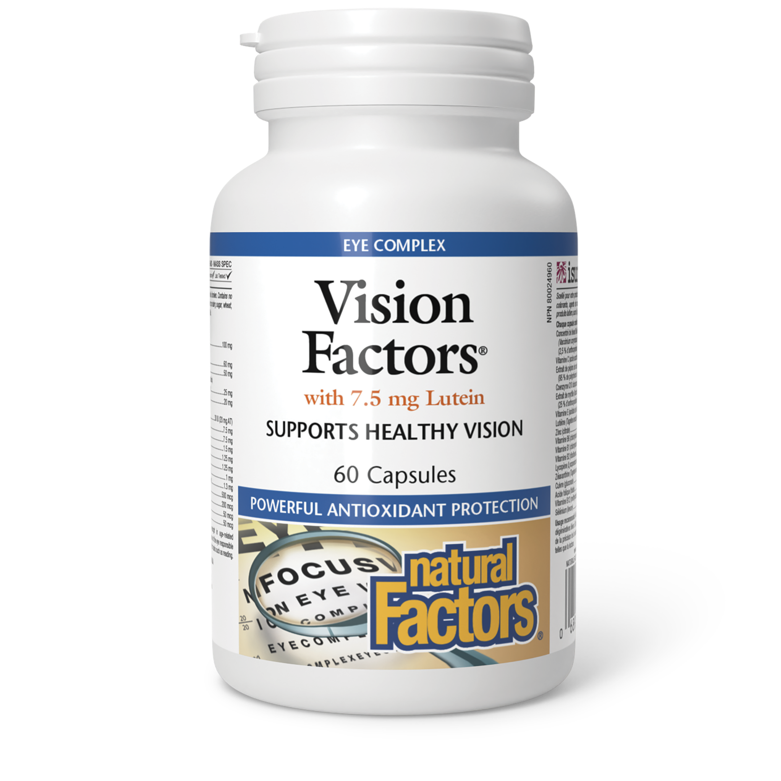 Our eyes need protection from the damaging effects of sunlight, pollution, and nutritional deficiencies. Natural Factors Vision Factors supports healthy vision with a broad range of protective nutrients from wholesome vegetables, fruits, and berries. It helps maintain eyesight in age-related degenerative conditions of the macula, the area of the eye responsible for detailed central vision that is used during tasks such as reading.Vision Factors combines flavonoids from BlueRich? Blueberry Concentrate and Bilberry extract to support night vision, the carotenoids lutein and zeaxanthin to protect the lens and retina against UV and blue light damage, the antioxidants red lycopene, CoQ10, and vitamins C and E to fight free radicals, as well as other key ingredients, such as B vitamins, zinc, selenium, and copper. Together, these nutrients are used to maintain healthy visual processes and protect the eyes from damage.Each capsule delivers powerful antioxidant protection with an optimal 7.5 mg dose of lutein. The custom blend of vitamins, minerals, and phytonutrients in Vision Factors offers a nutritional advantage to even the healthiest of eaters and is specifically formulated to meet the needs of those who are at risk for age-related macular degeneration and vision loss.