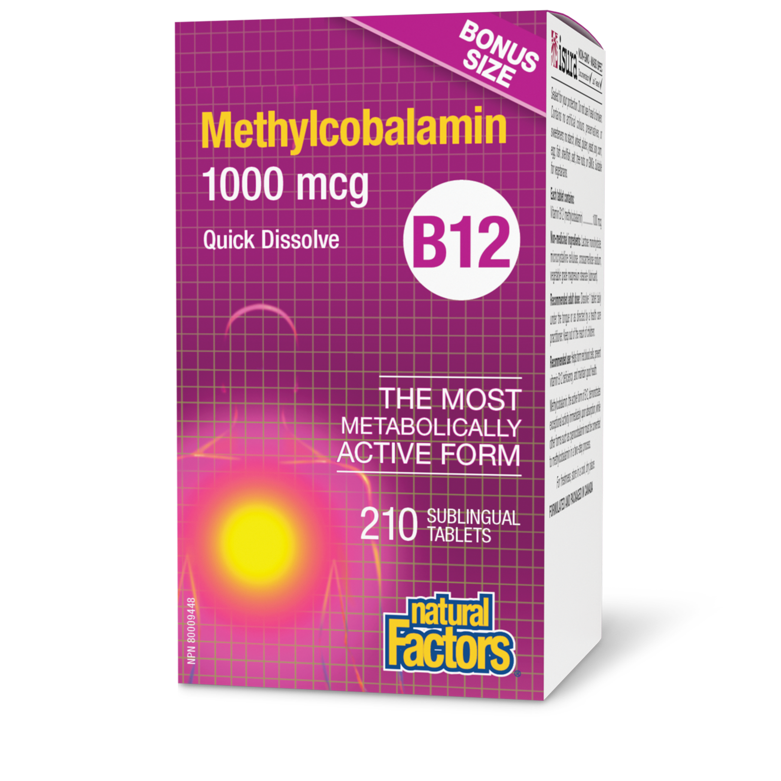 Natural Factors Methylcobalamin B12 provides the superior, biologically available, bioactive form of vitamin B12. This essential nutrient helps prevent vitamin B12 deficiency, is vital for the formation of red blood cells, and assists in the normal function of the immune system and energy metabolism in the body. This convenient, one-per-day, sublingual formula dissolves quickly, and is suitable for vegetarians, is gluten free, and is non-GMO.Methylcobalamin is a coenzyme form of vitamin B12. A coenzyme is a naturally occurring compound, such as a vitamin or mineral, that partners with specific enzymes to help maintain the body?s ability to metabolize nutrients. Preformed coenzyme forms of B vitamins, including methylcobalamin, offer immediate, direct nutritional support, even for those with genetic differences that impair metabolism of standard B vitamins.Natural Factors Methylcobalamin B12 is offered in a sublingual tablet ? no need for injections or to swallow pills! This advanced formula, available in different potencies, is ideal for anyone who wants the highest quality, most bioactive form of this key nutrient to prevent B12 deficiency and help maintain good health.