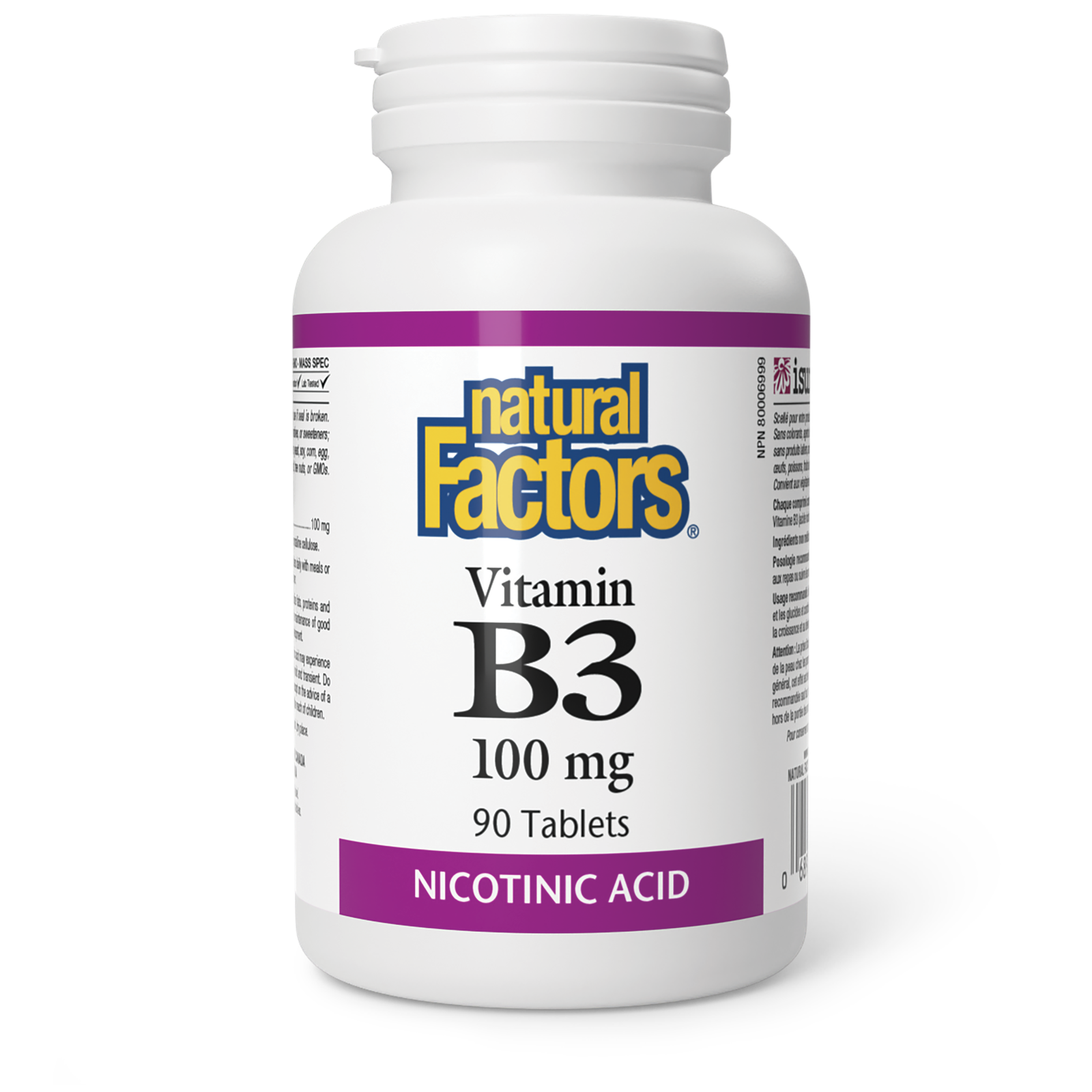 Vitamin B3, also called nicotinic acid or niacin, is an important factor in the maintenance of good health. It is a co-factor for enzymes that are vital to energy production and it helps the body convert carbohydrates, fats, and proteins into energy. Vitamin B3 is also vital to normal growth and development. More than just a key part of energy production, nicotinic acid has been shown to effectively reduce levels of LDL “bad” cholesterol and triglycerides in the blood, while helping to increase levels of HDL “good” cholesterol. It reduces LDL cholesterol by restricting the production of cholesterol in the liver.Vitamin B3 also supports cardiovascular health by acting as a potent vasodilator, which means it expands blood vessels to increase the flow of blood. As a result, niacin can sometimes cause an uncomfortable flushing effect, with itching, burning, or tingling in the skin. This is thought to be an important part of niacin?s therapeutic value on the circulatory system and these symptoms do not last. Natural Factors Vitamin B3 offers 100 mg of vitamin B3 as nicotinic acid, the most effective form for improving cardiovascular health and lowering cholesterol.