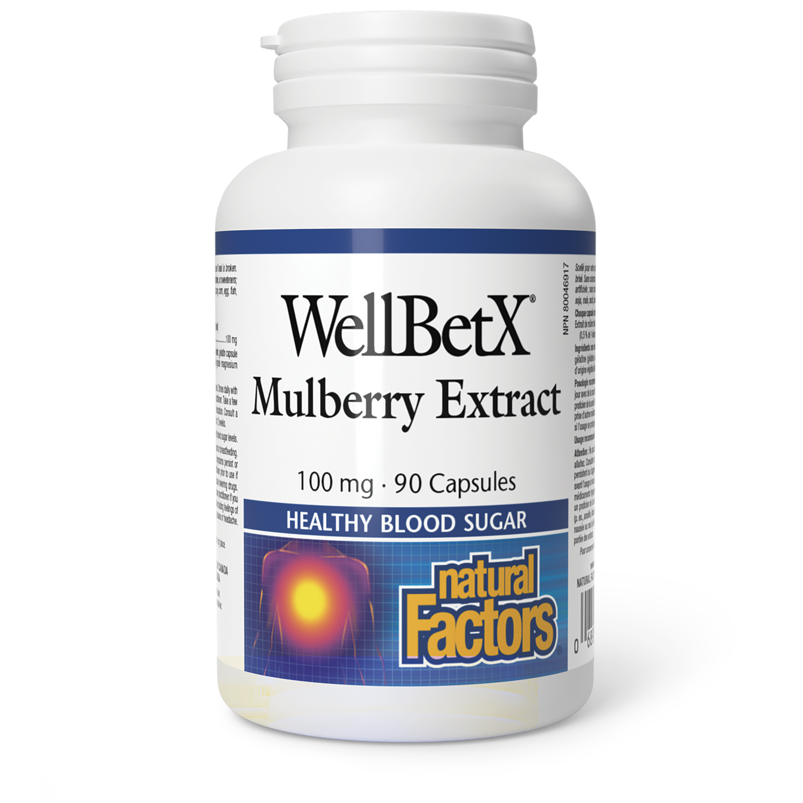 White mulberry extract, from the leaves of the Morus alba tree, contains several compounds that act as alpha-glucosidase enzyme inhibitors. Alpha-glucosidase enzymes break down carbohydrates into highly absorbable glucose molecules in the intestines. When these enzymes are inhibited, glucose is released more slowly from food, preventing the initial spike in blood sugar levels after eating, and the resulting spike in insulin secretion. It prolongs glucose absorption so that glucose levels remain more stable between meals.White mulberry extract also contains several antioxidant compounds that protect against inflammation and cellular damage caused by free radicals. The antioxidant activity of white mulberry is especially beneficial to the vascular system. It protects blood vessel walls from free radical damage, and prevents the oxidation of LDL (?bad?) cholesterol. Antioxidants can help prevent the circulatory problems associated with diabetes. WellBetX Mulberry Extract from Natural Factors provides 100 mg of high potency white mulberry extract in each capsule. The extract is standardized to 0.5% of key plant active 1-deoxynojirimycin to ensure effective blood sugar regulation. It is an excellent complement to other products in the WellBetX line.