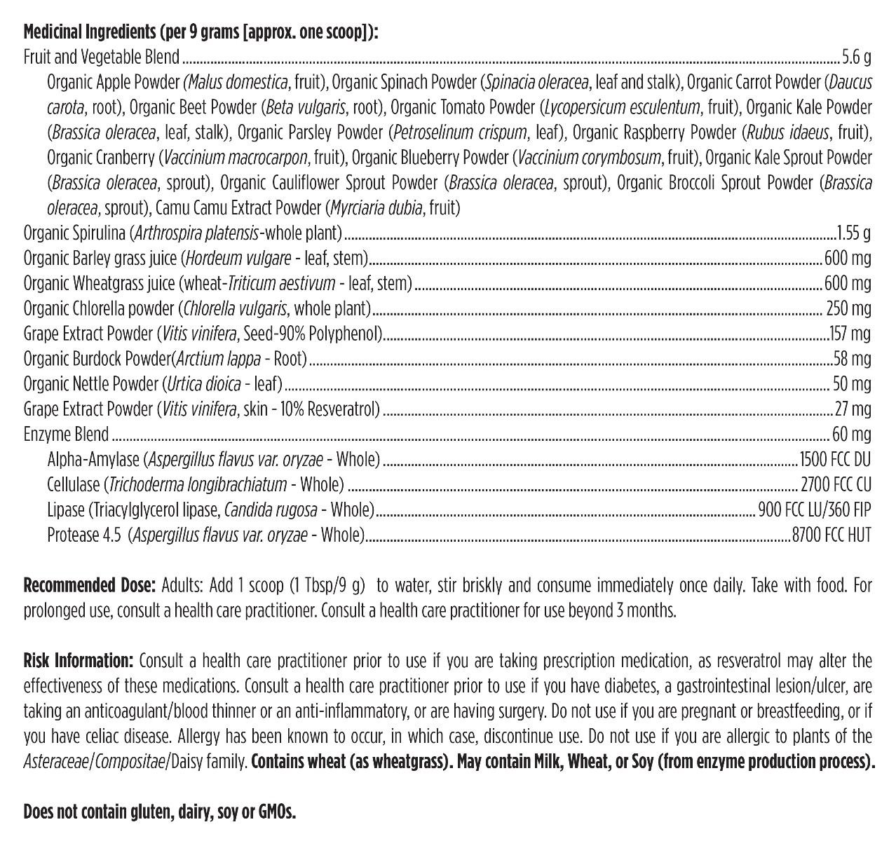 PaleoGreens™ is the great tasting Designs for Health greens food made with over 90% organic ingredients. The vegetable, fruit, and berry ingredients are brightly coloured and non-oxidized, as the powders are protected from heat, UV light and moisture from start to finish. These greens have a Paleo profile; they contain no grains, legumes, alfalfa, corn, gluten, fructose or artificial sweeteners. Unlike other greens products, we never add inexpensive fillers or bulking agents such as fibre, whole grasses, pectin, rice bran, and/or flax, which account for 40% to 60% of the content of most other greens products.