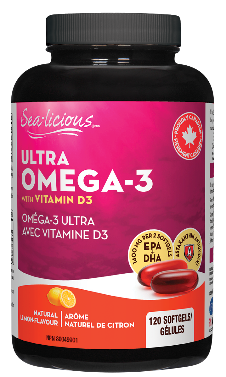 Non-medicinal Ingredients: Softgel (gelatin, glycerin, purified water, lemon oil), lemon oil, sunflower lecithin, non-GMO mixed tocopherols, astaxanthin, rosemary extract, ascorbyl palmitate.