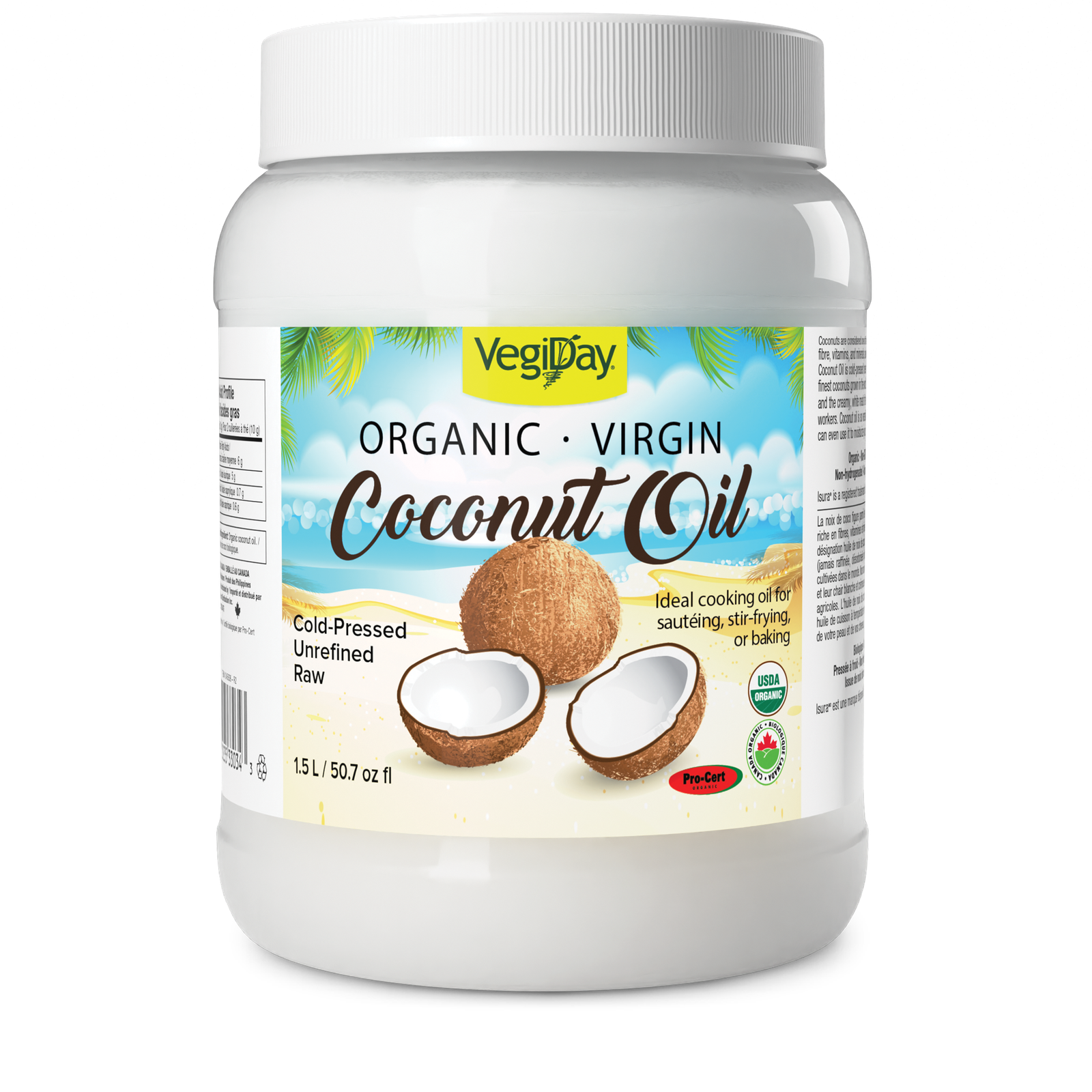 Recommended Use: Coconuts are considered one of the world’s most nourishing superfoods. They are rich in fibre, vitamins, and minerals, as well as the precious fat known as coconut oil. VegiDay Coconut Oil is cold pressed (never refined, deodorized or bleached!) from some of the finest coconuts grown in the world. Our coconuts are harvested at the peak of freshness and the creamy, white meat of the coconut is scooped out of the shell by hand by farm workers in a fair trade work environment. Coconut oil is so versatile – it’s ideal as a medium-heat cooking oil and you can even use it to moisturize your skin and hair.
