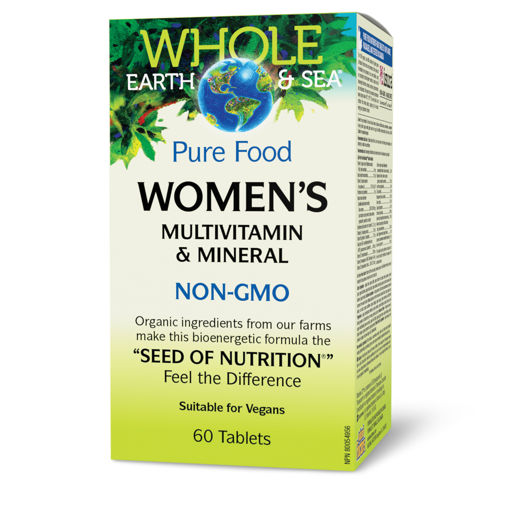 Bioenergetic Whole Earth & Sea formulas are the next generation of whole food supplements, delivering raw, whole food nutrition with real health benefits. Many of the vitamins and minerals in this nutrient-packed formula are sourced from plants such as amla, lichen, algae, kelp, natto, garlic, tomato, and sunflower. Food-source nutrients are more easily absorbed and used by the human body.Every Whole Earth & Sea formula contains meaningful amounts of each vitamin, mineral, and phytonutrient ? not just the minimum required to list it on the label! Each tablet includes 150 mg of Farm Fresh Factors?, sourced from fresh raw plants, whole sea vegetables, cruciferous sprouts, fruit, and herbs, many of them grown on Natural Factors certified organic, non-GMO farms. Proprietary EnviroSimplex? processing keeps the temperature below 48 ?C (118 ?F), resulting in raw nutrition that captures all the vibrant energy and goodness of nature. The Pure Food Women?s 50+ Multivitamin & Mineral contains vitamin and mineral complexes important for women over 50, including calcium and magnesium in a 2:1 ratio, vitamins D3 and K2, alpha-lipoic acid, and vitamin C. Easily absorbed active forms of folate and other B vitamins are also included, alongside enzymes, antioxidants, and phytonutrients for energy and vitality, making the vegan-friendly Women?s 50+ Multi ideal for older women looking for an organic, raw-food-based multi.
